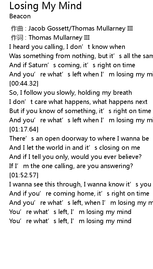 | [02:36.08] | And you’re what’s left, when I’m losing my mind |