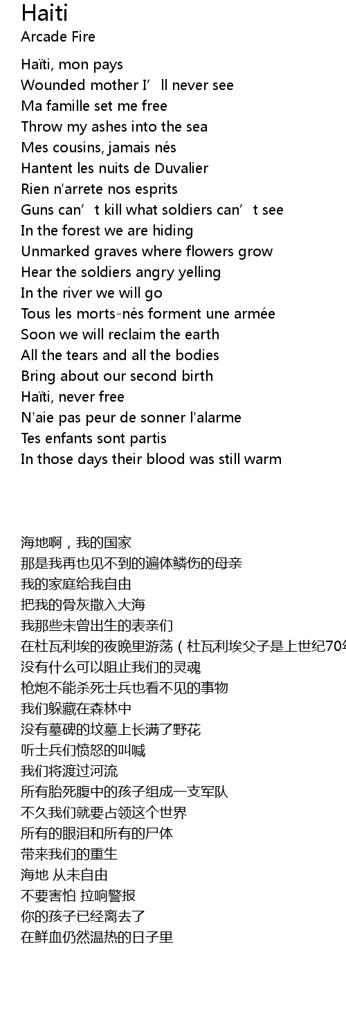 | [01:13.00] | 在杜瓦利埃的夜晚里游荡(杜瓦利埃父子是上世纪70年代海地的独裁者) |