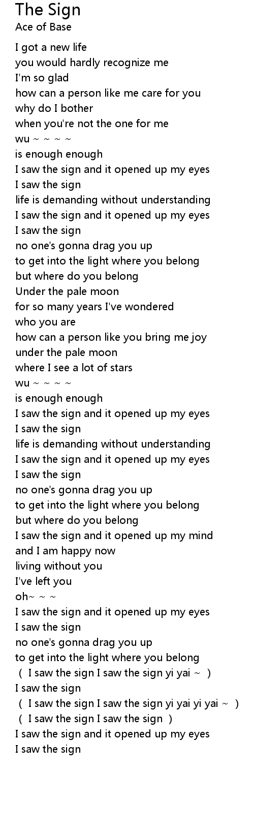 | [03:00.19] | I saw the sign and it opened up my eyes |