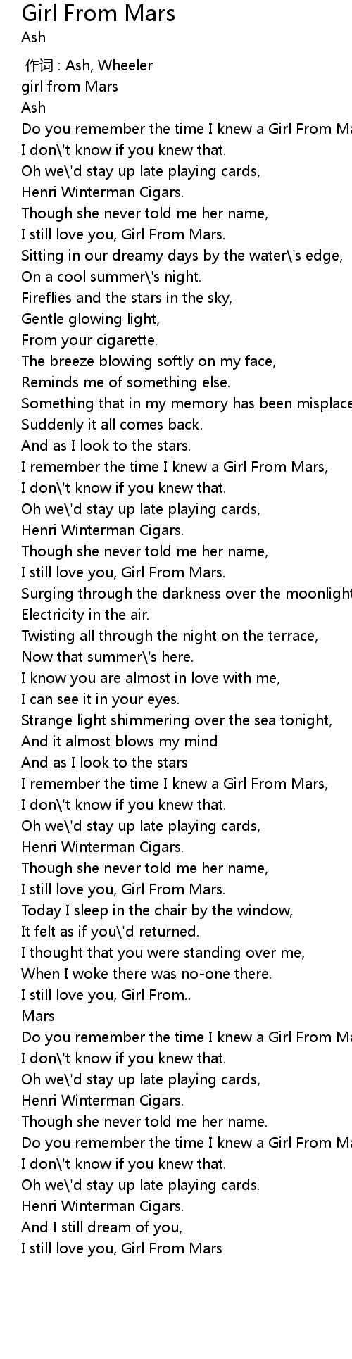| [00:00.93] | Do you remember the time I knew a Girl From Mars? |