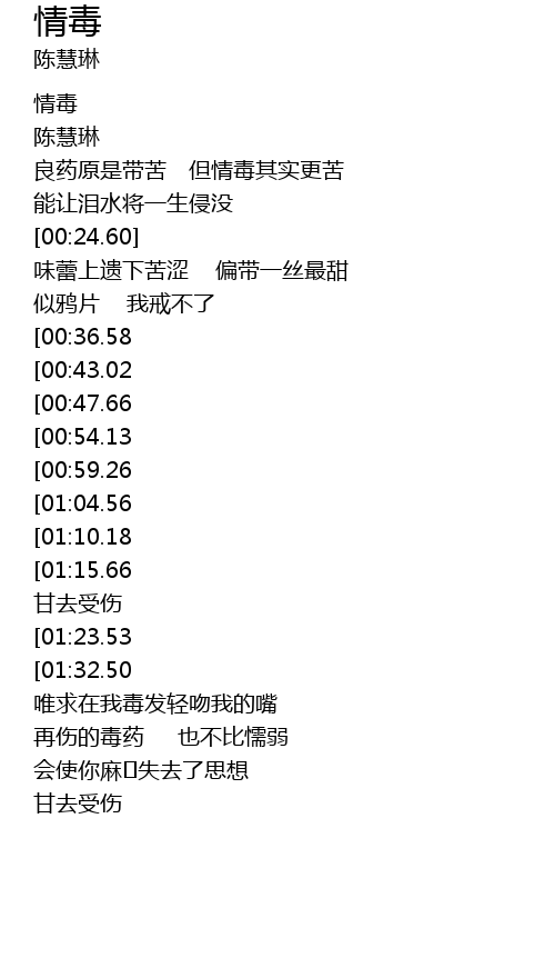 | [00:15.05] | 良药原是带苦 但情毒其实更苦 |