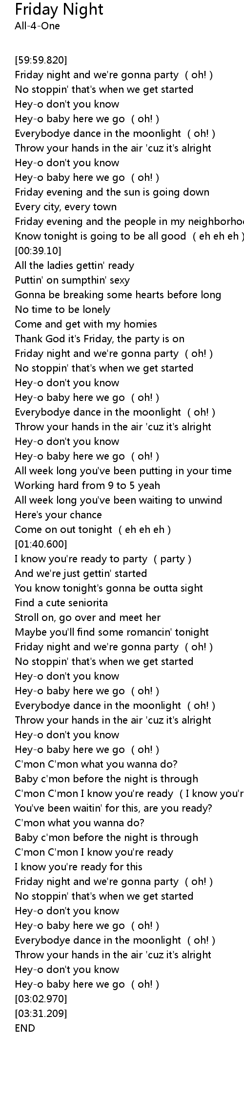 | [00:55.260] | Thank God it' s Friday, the party is on |