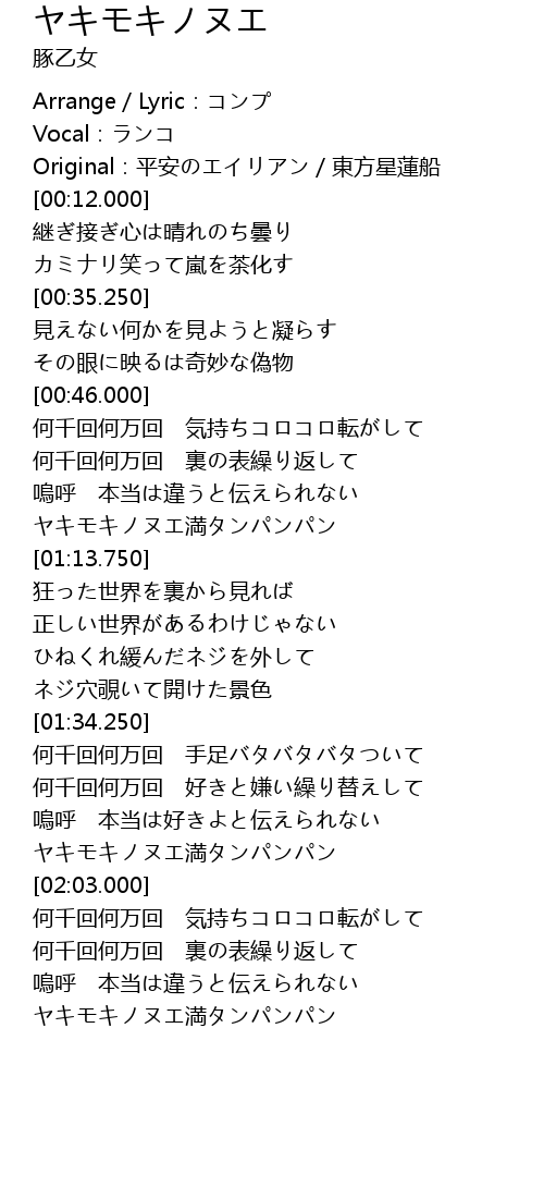 | [01:01.375] | ヤキモキノヌエ満タンパンパン |