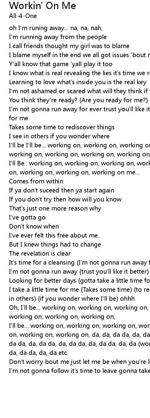 I'll be... working on, working on, working on, working on, working on, working on, working on, working on, da, da, da da, da, da da, da, da da, da, da da, da, da da, da, da da, da, da da, da, da da, da, da (working on me..) da, da, da da, da, da da, da, da etc. |