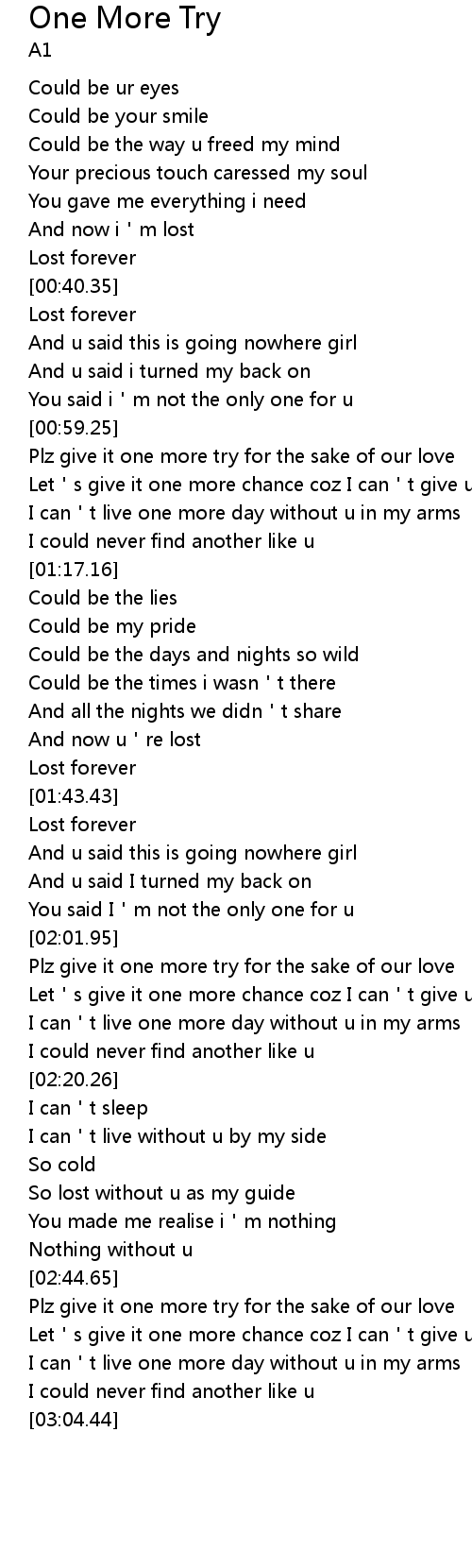 | [01:00.41] | Plz give it one more try for the sake of our love |