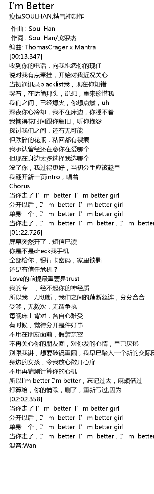 | [01:04.417] | dang ni zou le, I' m better I' m better, I' m better X2 |