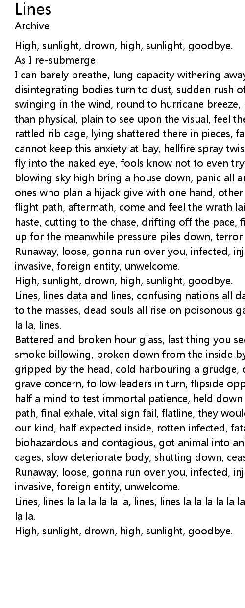Lines, lines data and lines, confusing nations all data inside, games shame lies to the masses, dead souls all rise on poisonous gasses, lines, lines la la la la la la, lines. |
