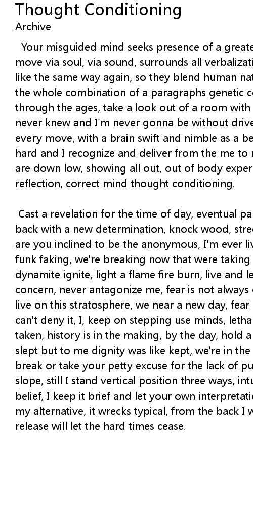 Your misguided mind seeks presence of a greater, fromaround the equator, as we move via soul, via sound, surrounds all verbalization nation never will it be, like the same way again, so they blend human nature in the excess, less you know the whole combination of a paragraphs genetic complex, many pages in the book, through the ages, take a look out of a room with a dark view, view a time I never knew and I'm never gonna be without drive on the highways taken, making every move, with a brain swift and nimble as a being I resemble my god, it's hard and I recognize and deliver from the me to me, seem to be, high society, are down low, showing all out, out of body experience, looking at your own reflection, correct mind thought conditioning.