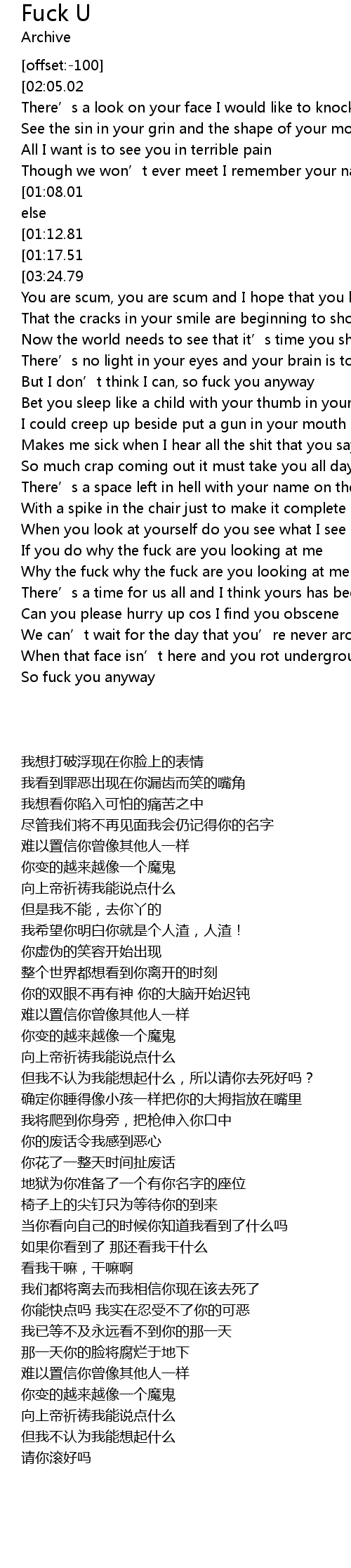 | [00:43.83][03:24.79] | But I don' t think I can so fuck you anyway |