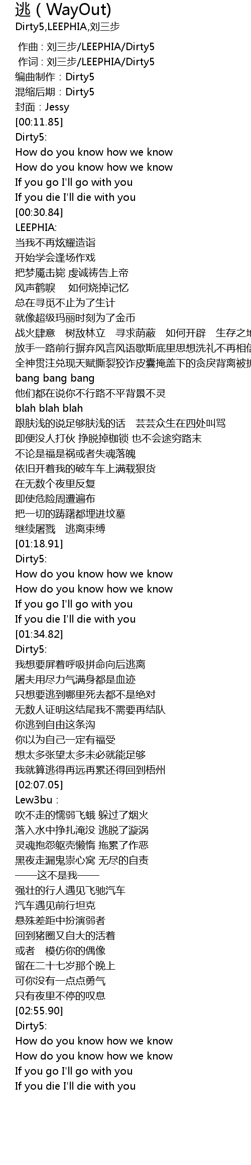 | [00:01.000] | 作词 : 刘三步/LEEPHIA/Dirty5 |