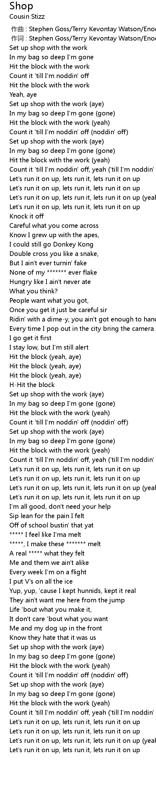 | [00:35.20] | Let' s run it on up, lets run it, lets run it on up |