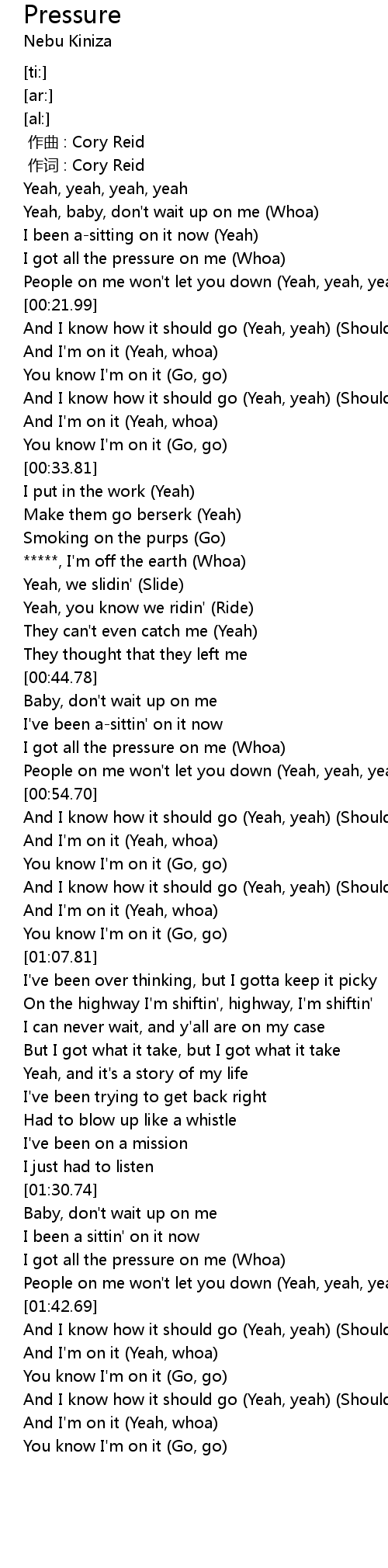 | [01:36.27] | I got all the pressure on me (Whoa) |