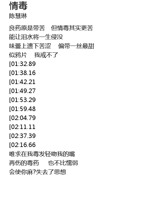 | [00:15.05] | 良药原是带苦 但情毒其实更苦 |