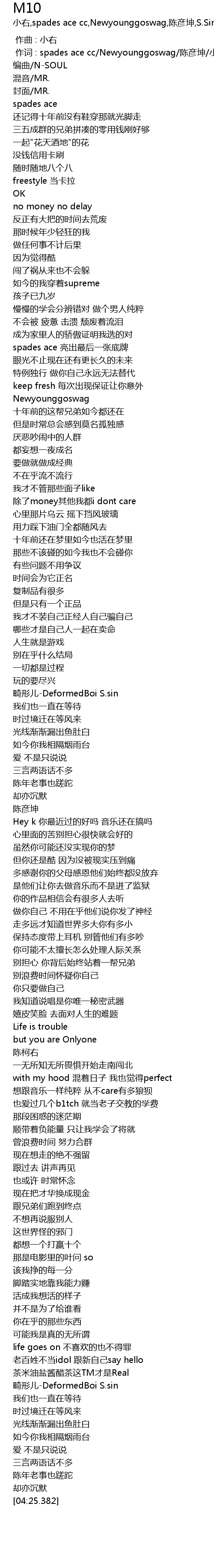 | [00:01.000] | 作词 : spades ace cc/Newyounggoswag/陈彦坤/小右/@S.SIN |