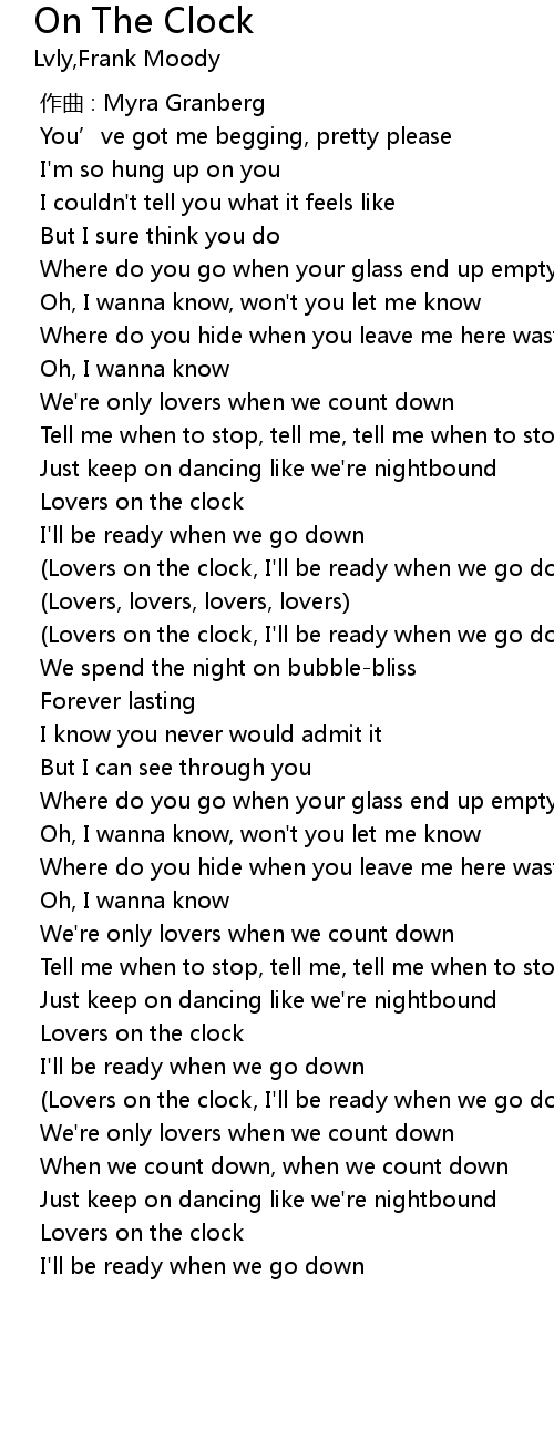 | [01:05.903] | Lovers on the clock, I' ll be ready when we go down |