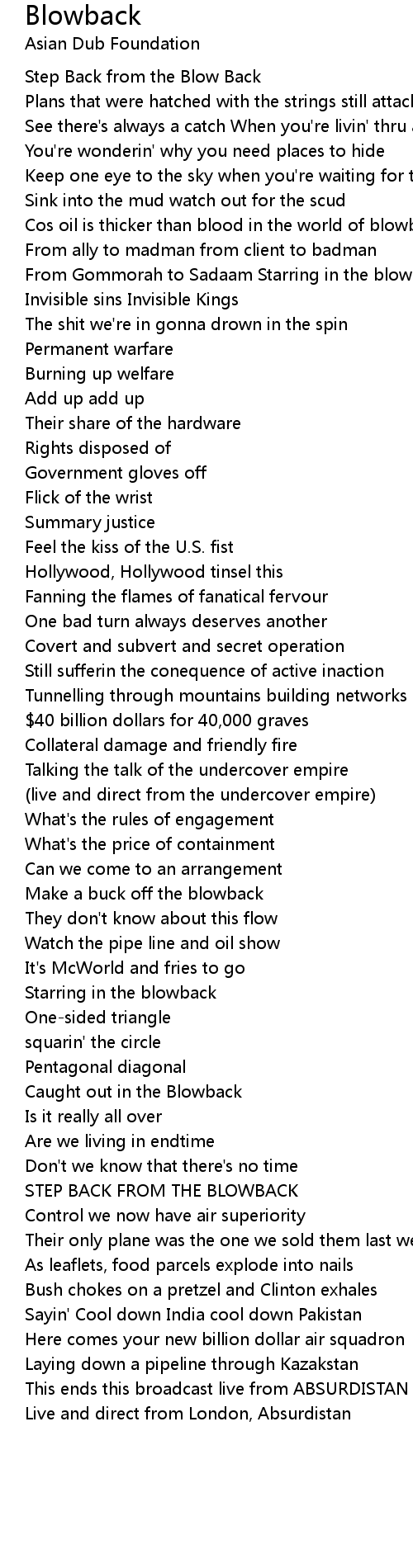 See there's always a catch When you're livin' thru a blow back |
