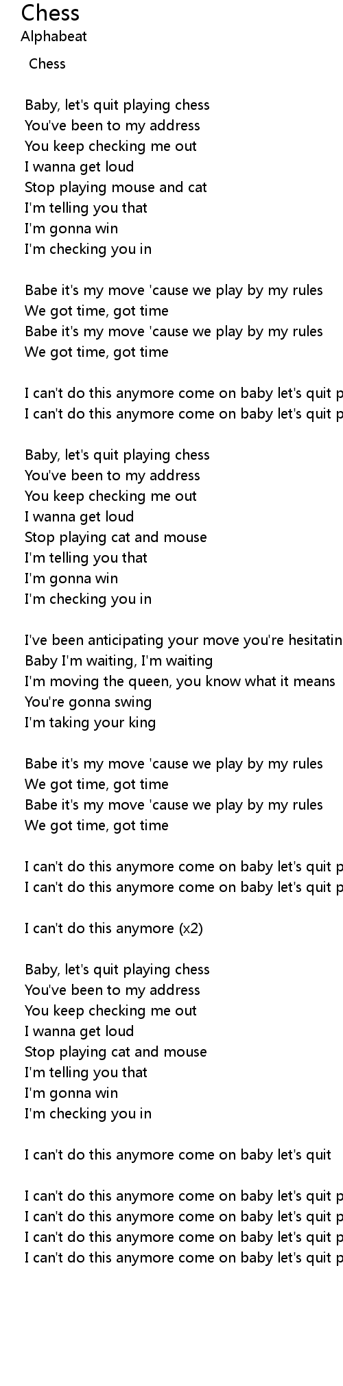 | I can't do this anymore come on baby let's quit playing chess | |