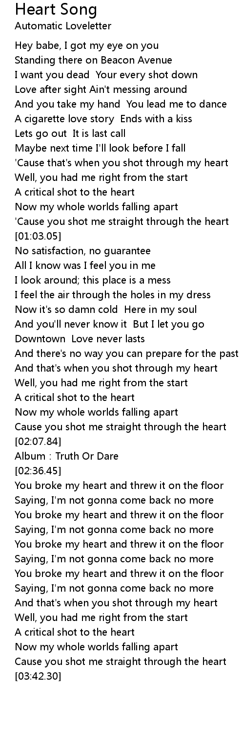 | [00:31.22] | 'Cause that's when you shot through my heart |