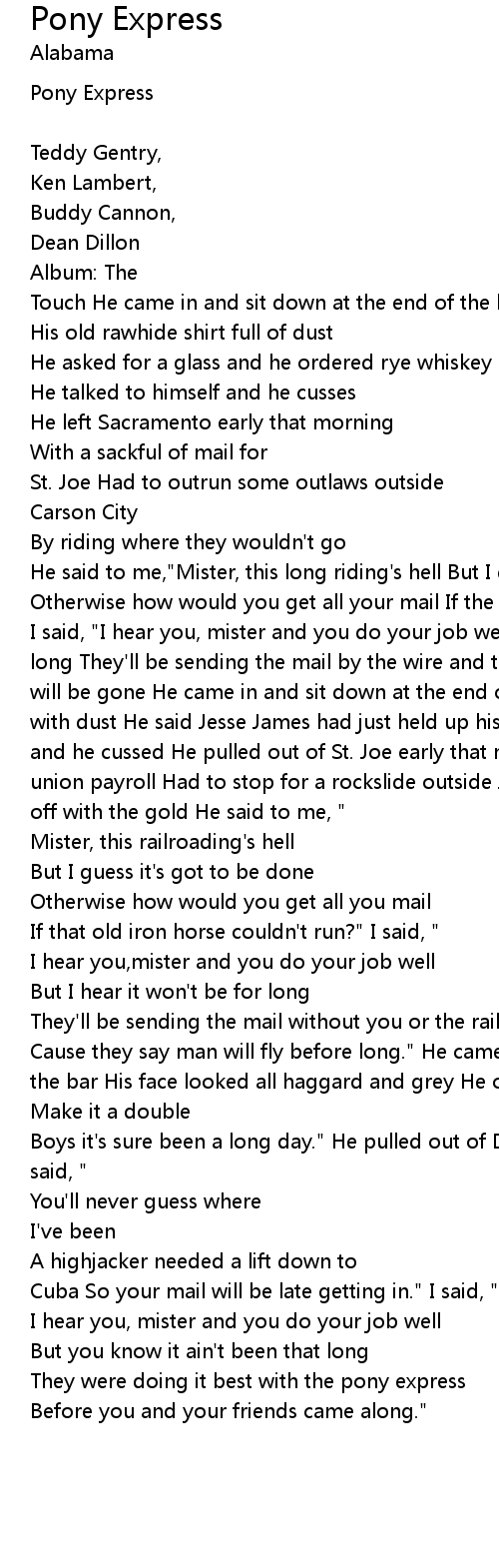 | I said, "I hear you, mister and you do your job well But I hear it won't be for long They'll be sending the mail by the wire and the rail And your pony and you will be gone He came in and sit down at the end of the bar His coveralls covered with dust He said Jesse James had just held up his train He talked to himself and he cussed He pulled out of St. Joe early that morning With the mail and the union payroll Had to stop for a rockslide outside Jackson City And Jesse made off with the gold He said to me, " | |