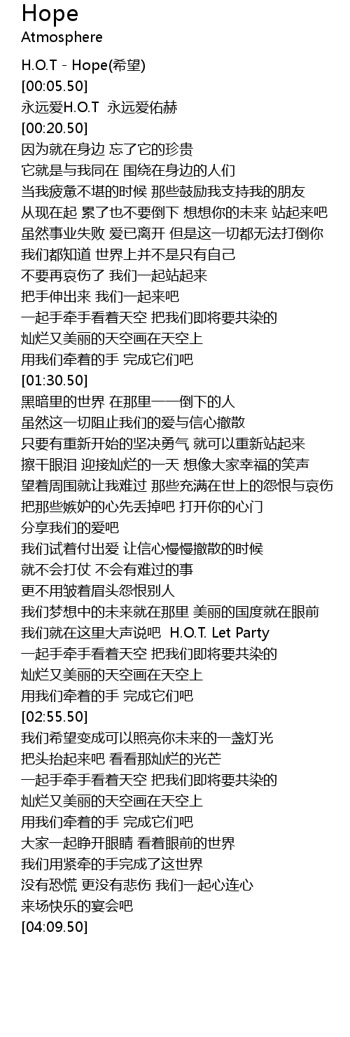 | [00:00.50] | H.O.T - Hope(希望) |
