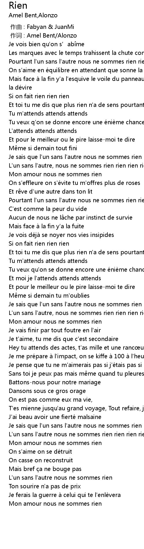 | [03:04.94] | Je sais que l'un sans l'autre nous ne sommes rien rien rien rien rien |