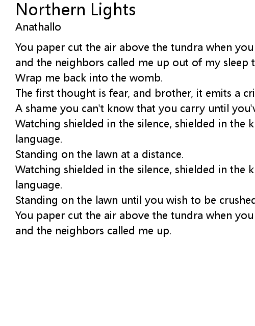 You paper cut the air above the tundra when you came back in silence, in sheets, and the neighbors called me up out of my sleep to watch you unfold the blanket. |