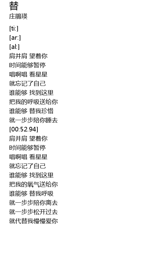 | [01:45.16] | shuí néng gòu tì wǒ hū xī |