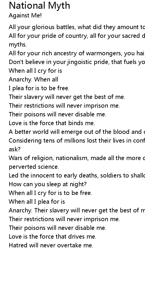 All for your pride of country, all for your sacred democracy, rival national myths.