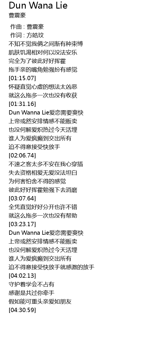 | [03:23.60] | Dun Wanna Lie爱恋需要爽快 |
