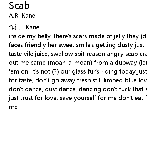 | inside my belly, there's scars made of jelly they (dance) on a teddy, on aging faces friendly her sweet smile's getting dusty just trust for love don't eat for taste vile juice, swallow spit reason angry scab crack split let them all stay out me came (moan-a-moan) from a dubway (let them all stay out of me) don't turn 'em on, it's not (?) our glass fur's riding today just trust for love don't eat for taste, don't go away fresh still limbed blue love toy painting slimmed away don't dance, dust dance, dancing don't fuck that slow one save yourself for me just trust for love, save yourself for me don't eat for taste, save yourself for me |