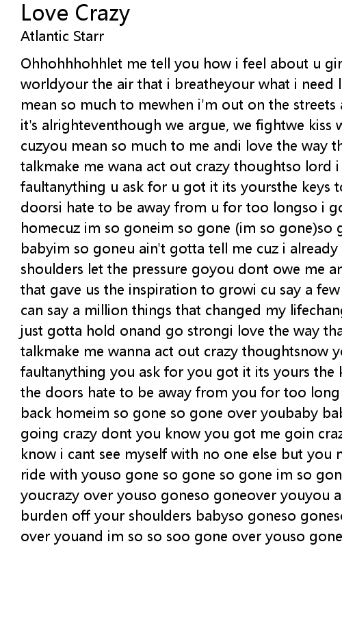 Ohhohhhohhlet me tell you how i feel about u girlyou're my friend, my lover, my worldyour the air that i breatheyour what i need like a car needs gasgirl you mean so much to mewhen i'm out on the streets at nightyou don't have to worry it's alrighteventhough we argue, we fightwe kiss we makeupwe always work it out cuzyou mean so much to me andi love the way that you walkyour smile your sexy talkmake me wana act out crazy thoughtso lord i can't stand but it ain't your faultanything u ask for u got it its yoursthe keys to the crib and all of the doorsi hate to be away from u for too longso i gotta hurry up so i can get back homecuz im so goneim so gone (im so gone)so gone over youim crazy over you babyim so goneu ain't gotta tell me cuz i already knowtake the burden off your shoulders let the pressure goyou dont owe me an explanationwe're in uh situation that gave us the inspiration to growi cu say a few things that i dont like bu i can say a million things that changed my lifechanged my lifeim so gonenow we just gotta hold onand go strongi love the way that you walkyour smile your sexy talkmake me wanna act out crazy thoughtsnow you got me staring bu it aint your faultanything you ask for you got it its yours the keys to the crib and all of the doors hate to be away from you for too long so i gotta hurry up so i can get back homeim so gone so gone over youbaby baby im so gone so gone over yougot me going crazy dont you know you got me goin crazy let me take the time to let you know i cant see myself with no one else but you no one youre the sun and girl i ride with youso gone so gone so gone im so gone so gone said im so gone over youcrazy over youso goneso goneover youyou aint even gotta tell me baby take the burden off your shoulders babyso goneso goneso goneover you yousaid im crazy over youand im so so soo gone over youso goneover you babyso goneover you baby |
