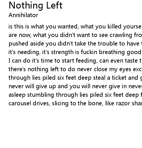 | I can do it's time to start feeding, can even taste the bleeding good god there's nothing left to do never close my eyes except to fall asleep, stumbling through lies piled six feet deep steal a ticket and get on the ride again you never will give up and you will never give in never close my eyes except to fall asleep stumbling through lies piled six feet deep faster and faster, the carousel drives, slicing to the bone, like razor sharp knives |