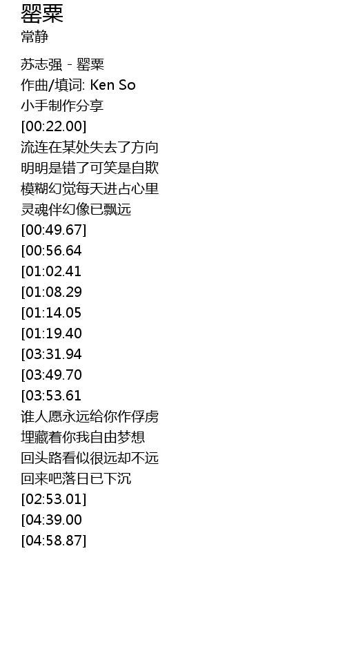 | [04:03.96][03:31.94][01:28.69] | 失落 是你自寻 HA...HA |