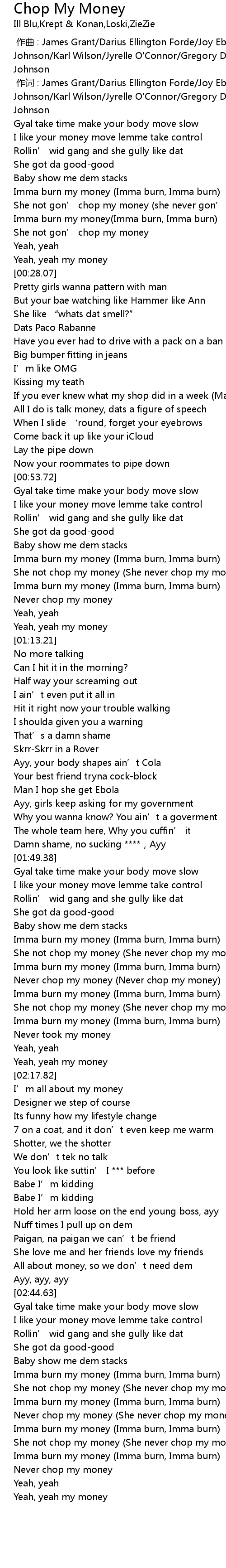 | [02:04.85] | Never chop my money (Never chop my money) |