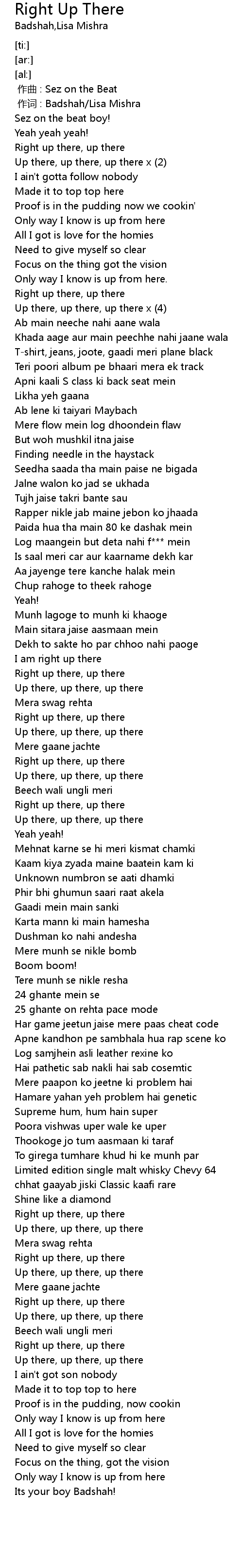 | [00:00.010] | zuo ci : Badshah Lisa Mishra |