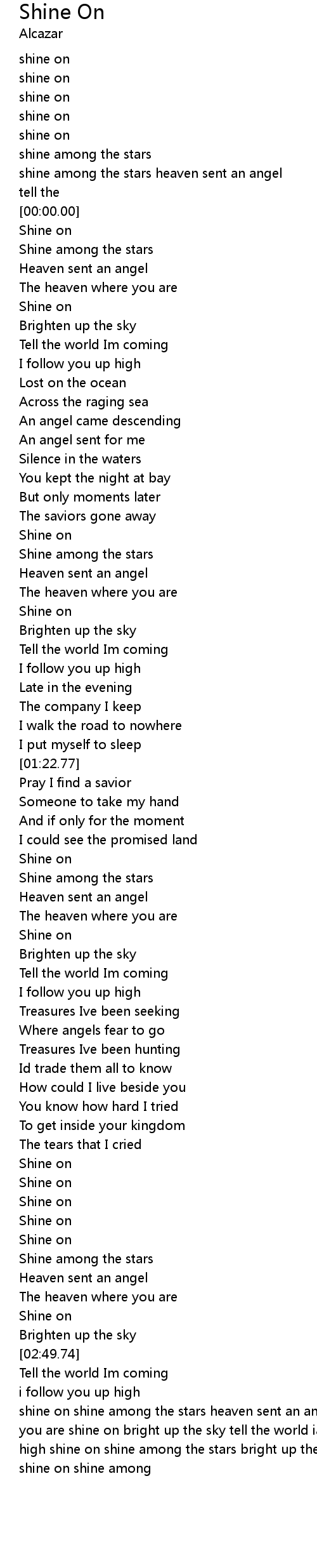 shine on shine among the stars heaven sent an angel the heaven where you are shine on bright up the sky tell the world iam coming i follow you up high shine on shine among the stars bright up the sky tell the world iam coming shine on shine among |