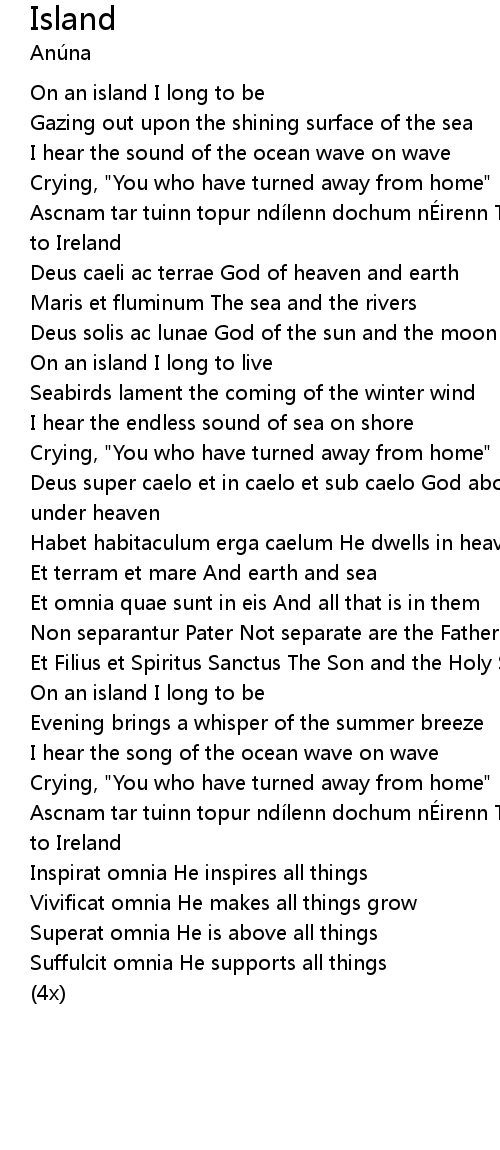 | Ascnam tar tuinn topur ndí lenn dochum nÉ irenn To sail across the wild sea back to Ireland | |