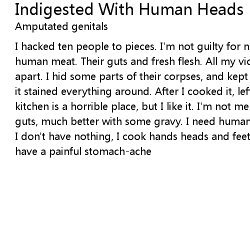 I hacked ten people to pieces. I'm not guilty for nothing. I'm happy. I like human meat. Their guts and fresh flesh. All my victims were hunted and cut apart. I hid some parts of their corpses, and kept only I wanted to mess because it stained everything around. After I cooked it, left an awful stench. My kitchen is a horrible place, but I like it. I'm not merciful. A big plate of guts, much better with some gravy. I need human meat. Nothing else to eat. When I don't have nothing, I cook hands heads and feet in a soup, cause if fried, I have a painful stomach-ache |
