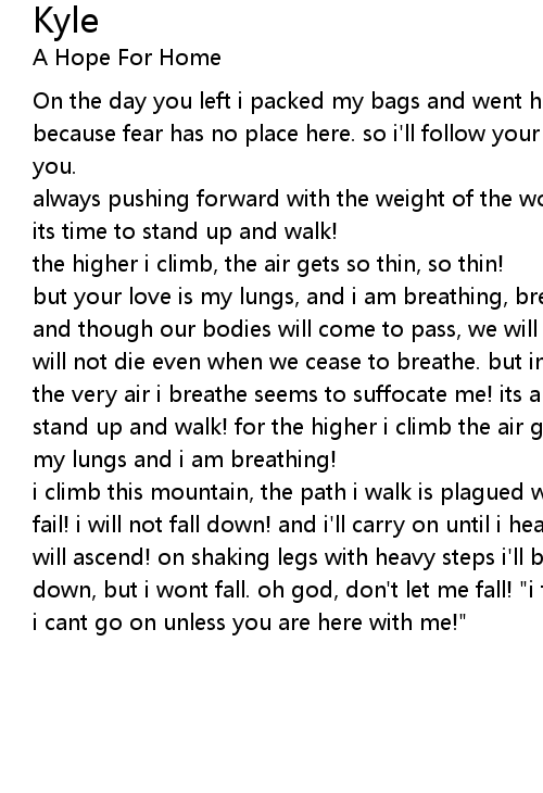i climb this mountain, the path i walk is plagued with doubt. but i will not fail! i will not fall down! and i'll carry on until i hear you call me home. i will ascend! on shaking legs with heavy steps i'll bear this cup that weighs me down, but i wont fall. oh god, don't let me fall! "i try, to hold myself up but i cant go on unless you are here with me!" |