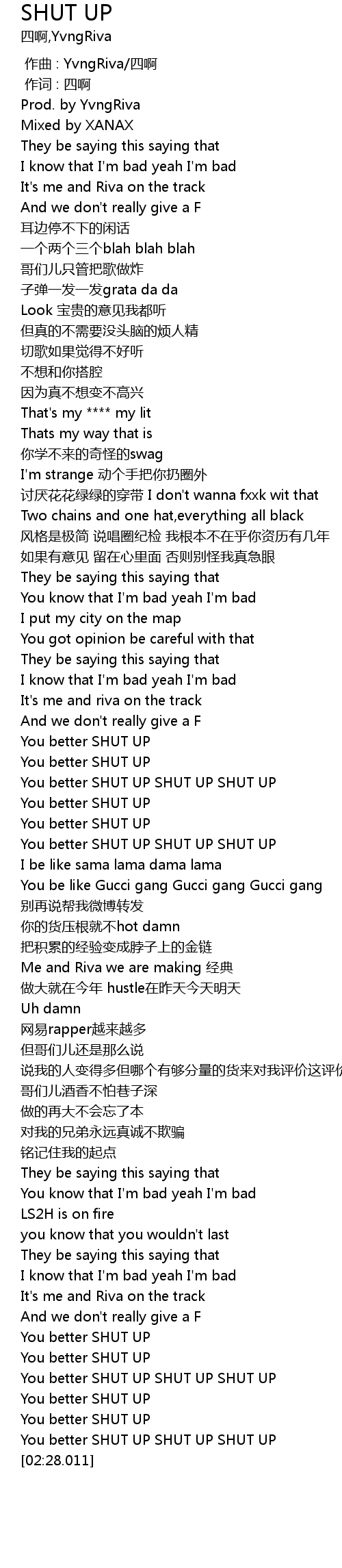 | [02:16.079] | You better SHUT UP SHUT UP SHUT UP |