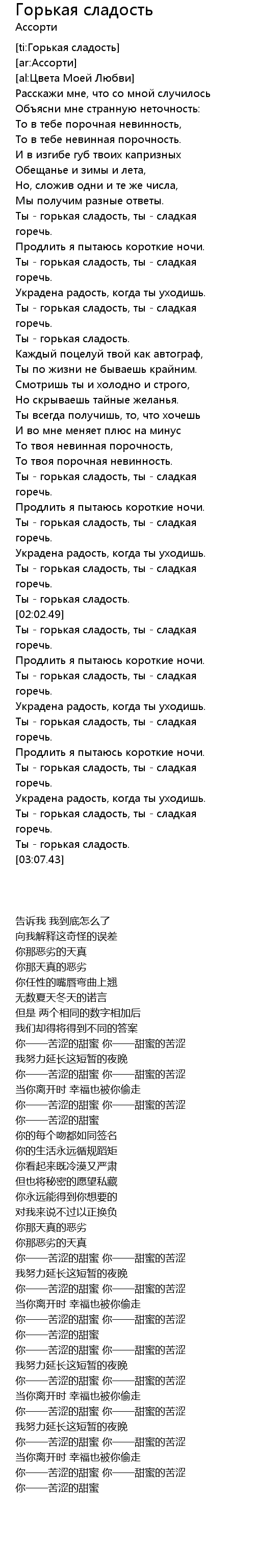 | [02:40.72] | Ты - горькая сладость, ты - сладкая горечь. |