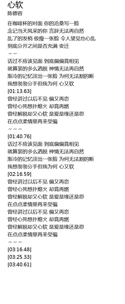| [03:02.98] | céng jīng jiě tuō què yòu xīn ruǎn shì ài shì yuán hái shì yuàn |