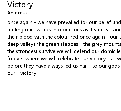 once again - we have prevailed for our belief under the sun - we have fought hurling our swords into our foes as it spurts - and covers the grass drinking their blood with the colour red once again - our tribe dominates and the dark deep valleys the green steppes - the grey mountains there can be only one tribe the strongest survive we will defend our domicile hail there's a feast tonight forever where we will celebrate our victory - as we have done so many times before they have always led us hail - to our gods - they are with us we know to our - victory |