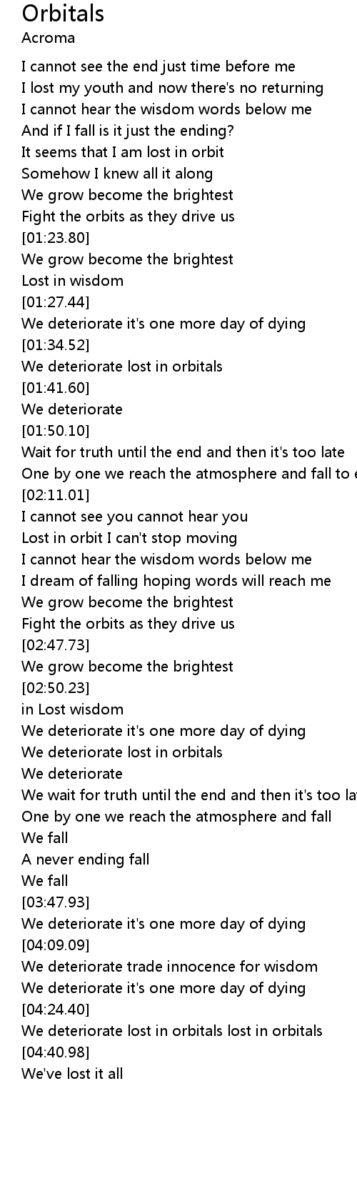 | [04:28.57] | We deteriorate lost in orbitals lost in orbitals |