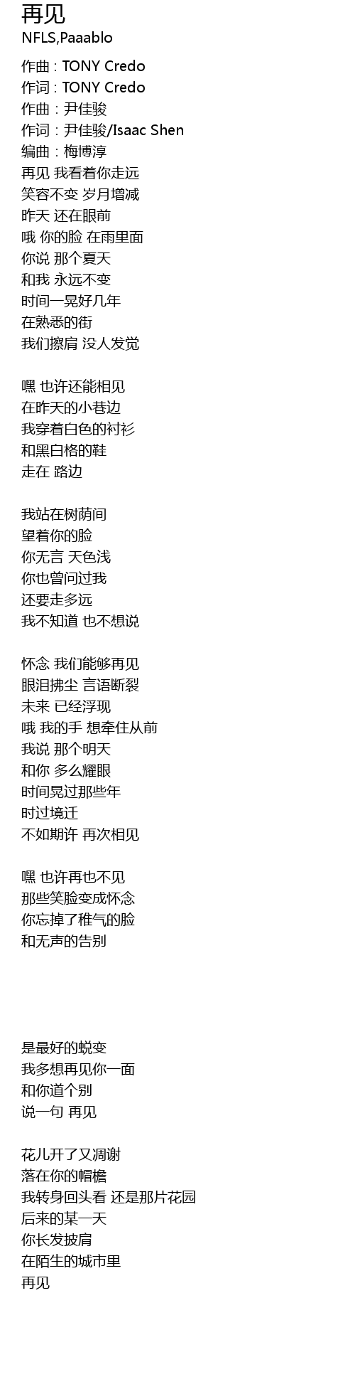 | zài jiàn wǒ kàn zhe nǐ zǒu yuǎn | |