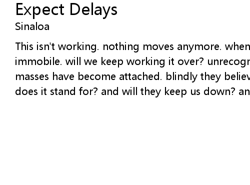 | This isn't working. nothing moves anymore. when it rusts over and becomes immobile. will we keep working it over? unrecognizable at this point. but the masses have become attached. blindly they believe all that it stands for. what does it stand for? and will they keep us down? and will we keep us down? |