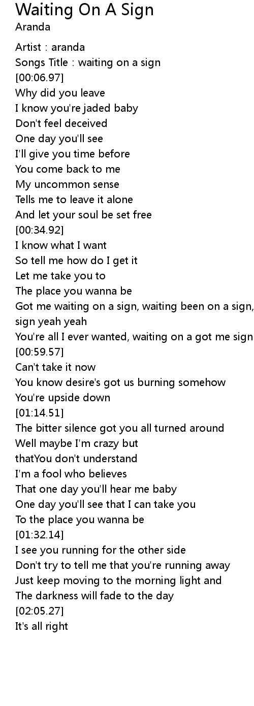 | [00:41.17] | Got me waiting on a sign, waiting been on a sign, got me waiting on a sign yeah yeah |