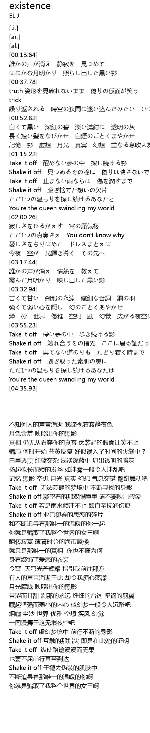 | [03:55.47] | Take it off 儚い夢の中 歩き続ける影 |