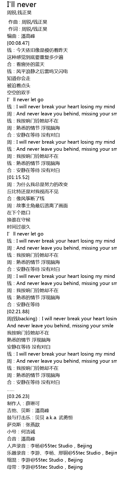| [02:35.65] | zhōu qián backing: I will never break your heart losing my mind |