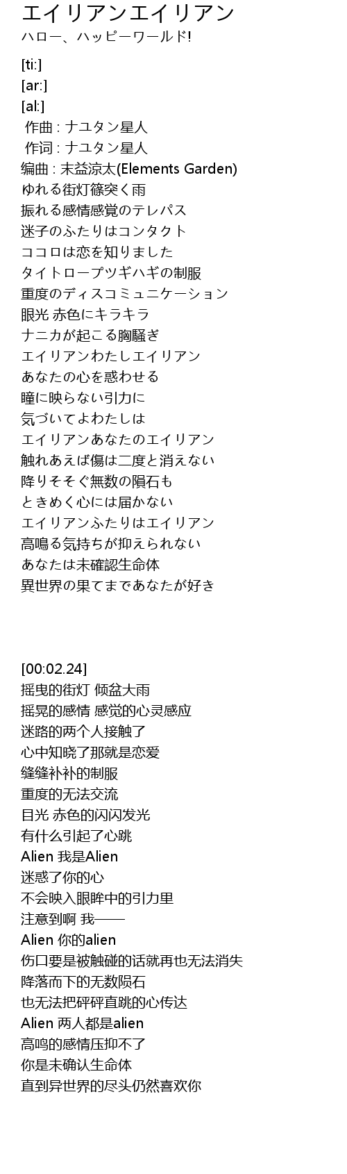 | [00:59.46] | エイリアンわたしエイリアン |